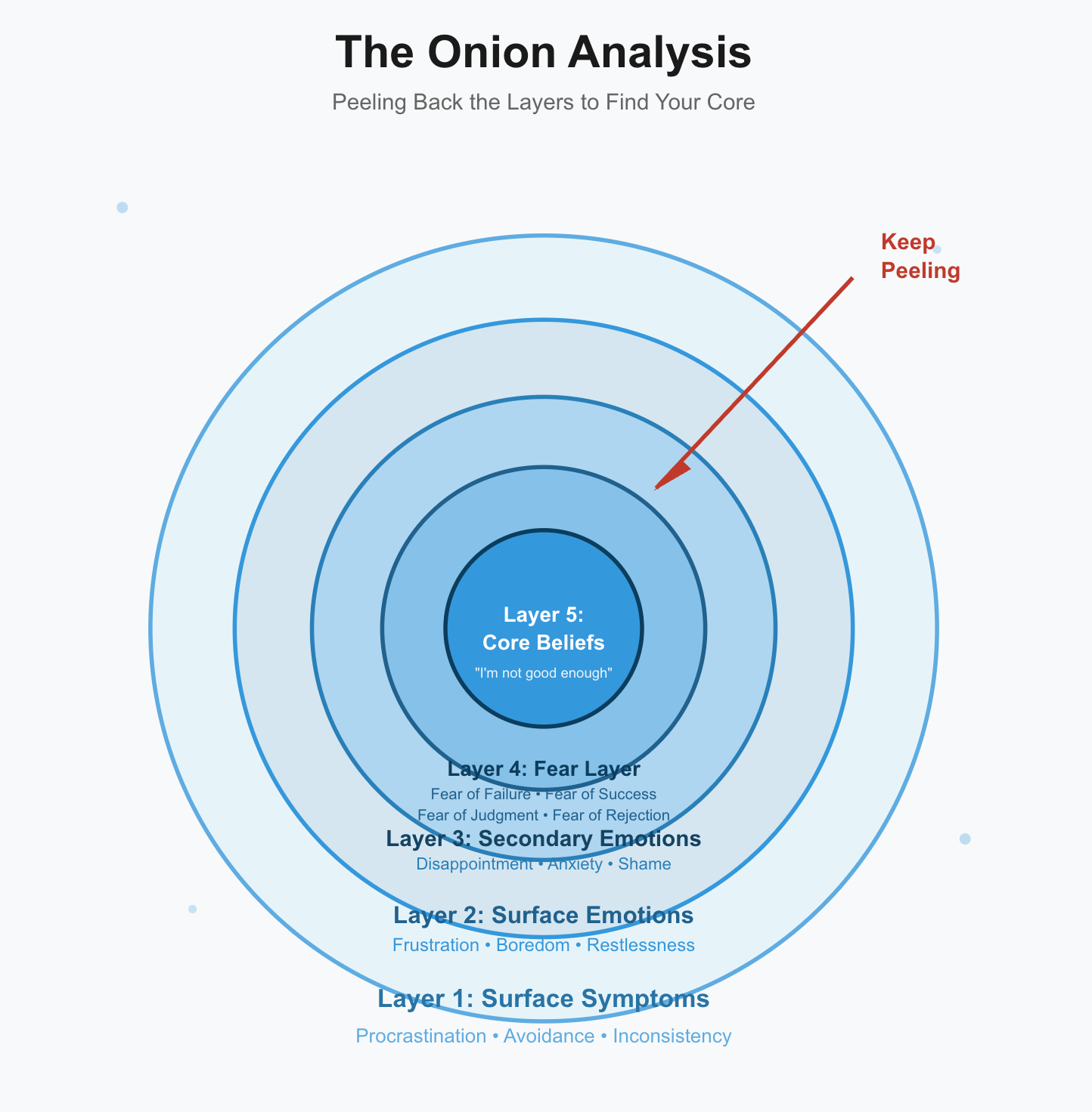 Think of your challenges like an onion. What you see on the surface—the procrastination, the inconsistency, the self-sabotage—is just the outer layer. Underneath are deeper layers of emotions, fears, and ultimately, core beliefs about yourself that are running the show.